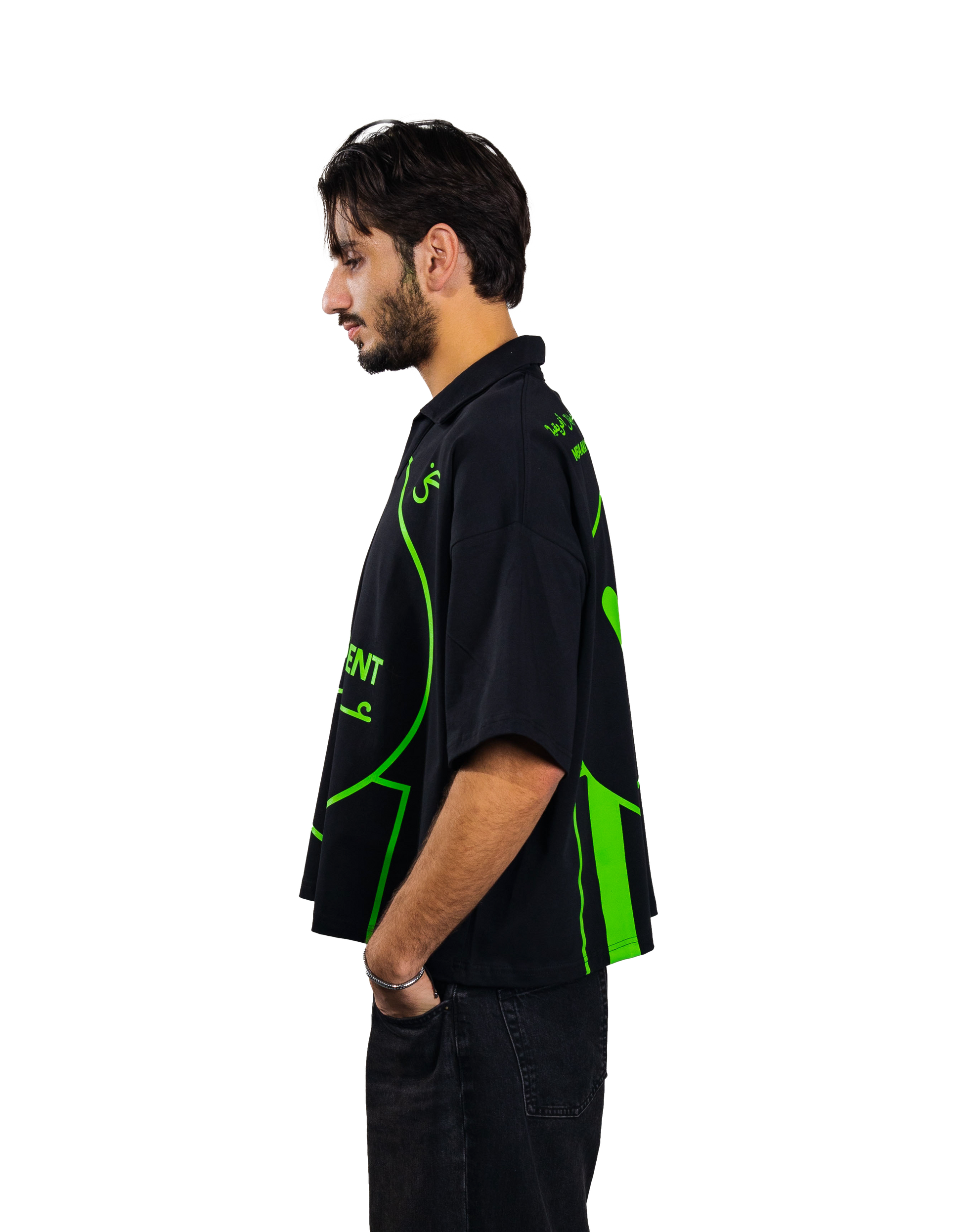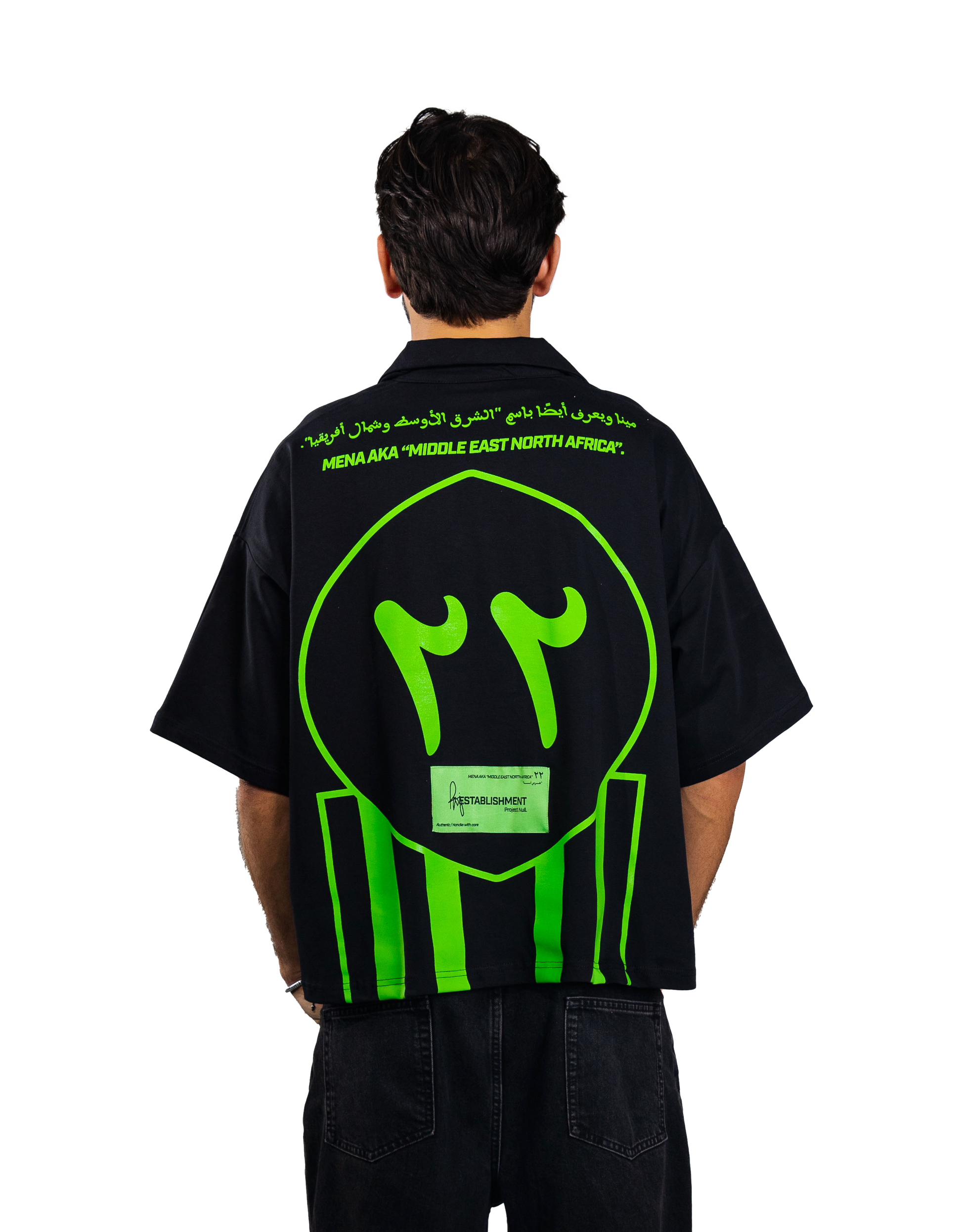 This piece reimagines the retro football jersey through our lens. Bold type graphic on the front in Arabic and English. Number 22 on the back in a shield, symbolizing the 22 Arab League nations.