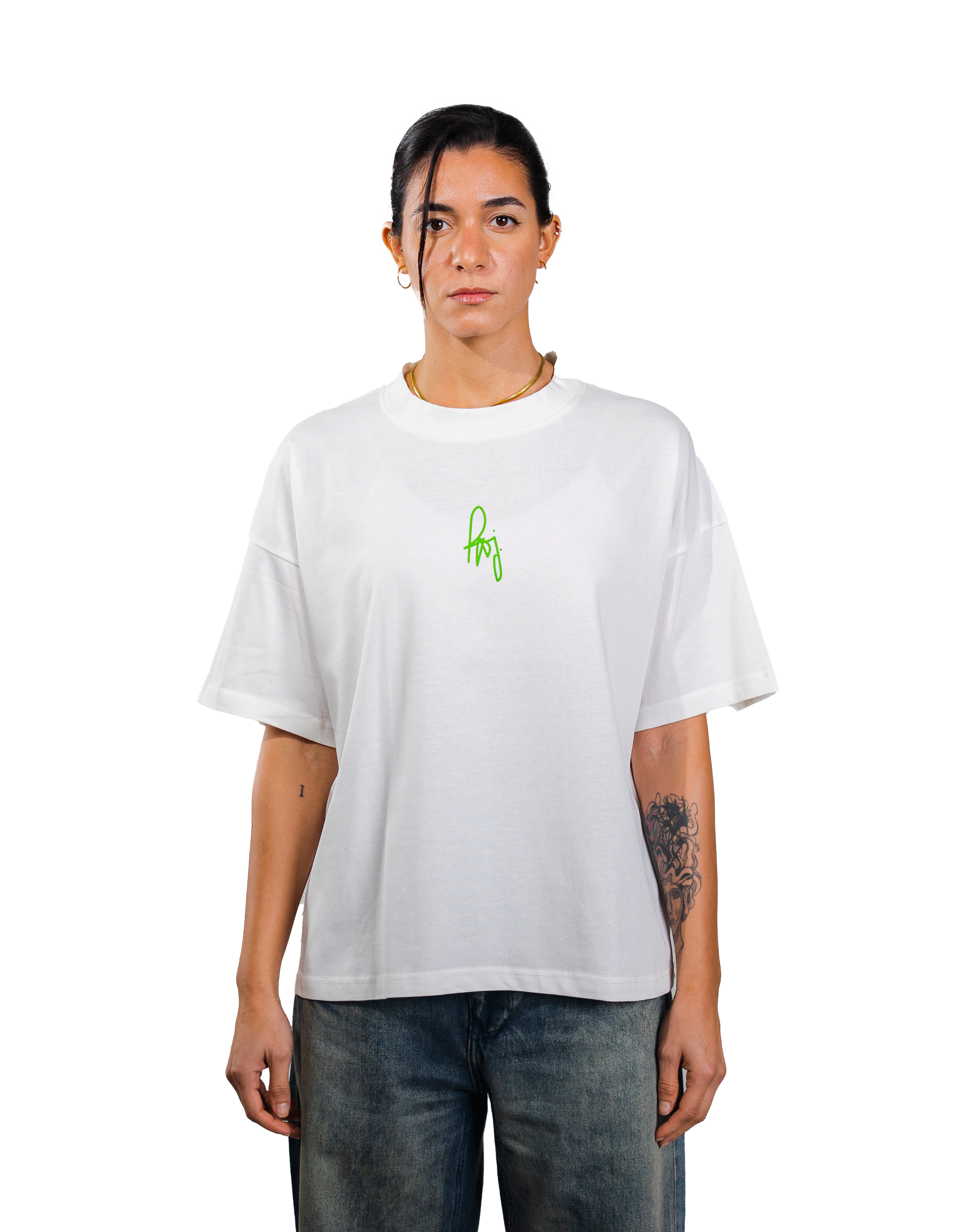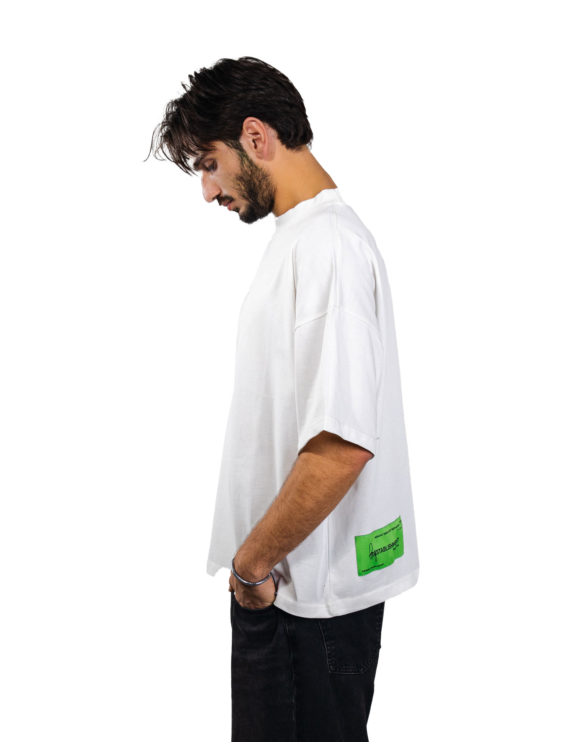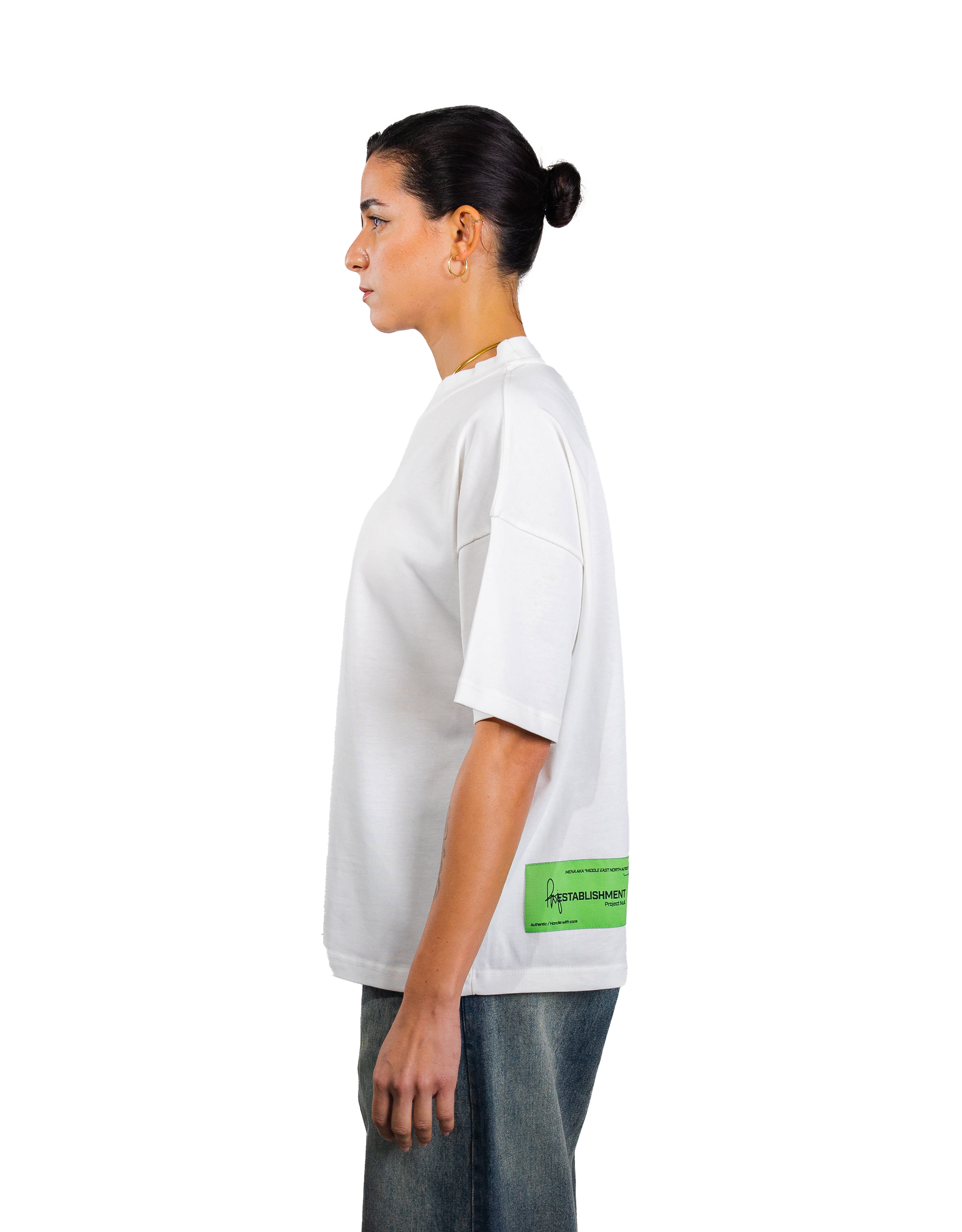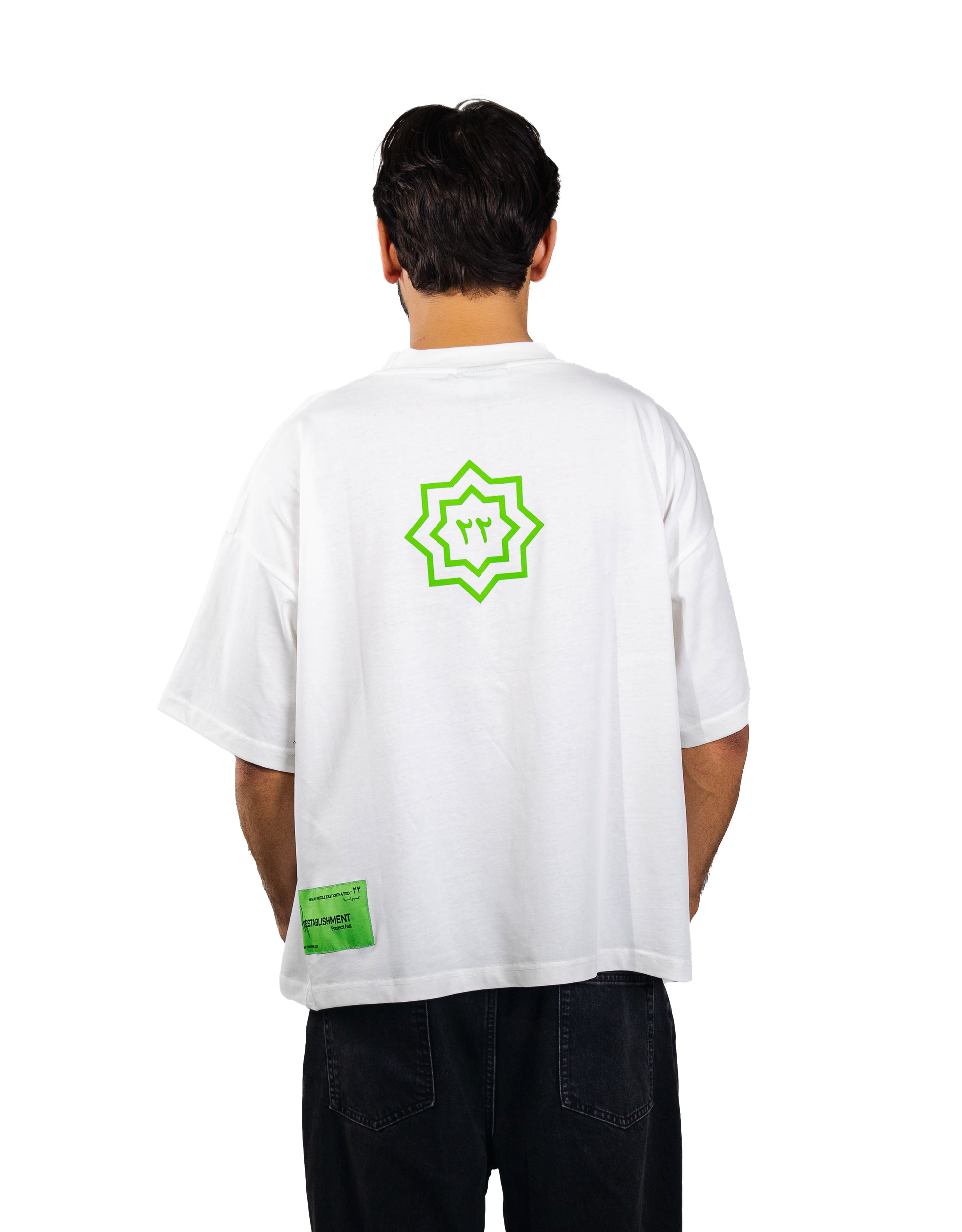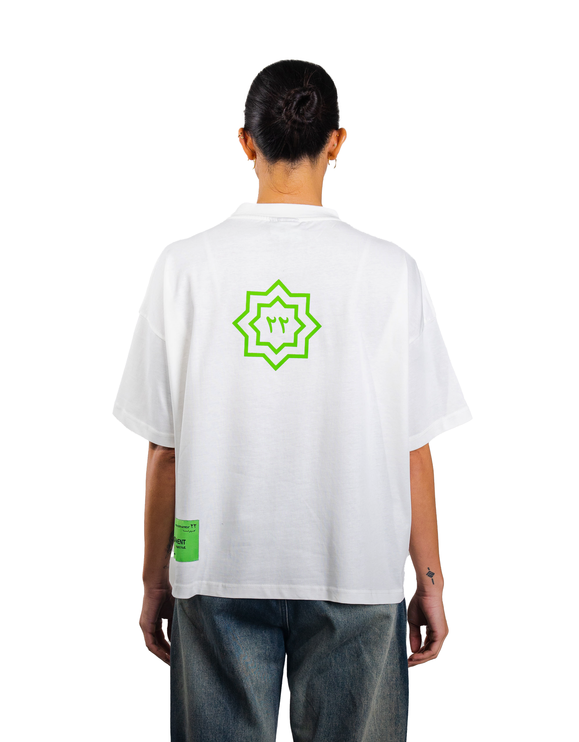 This white tee features a clean front with the proj.establishment icon and a bold motif on the back. Representing the 22 Arab nations.